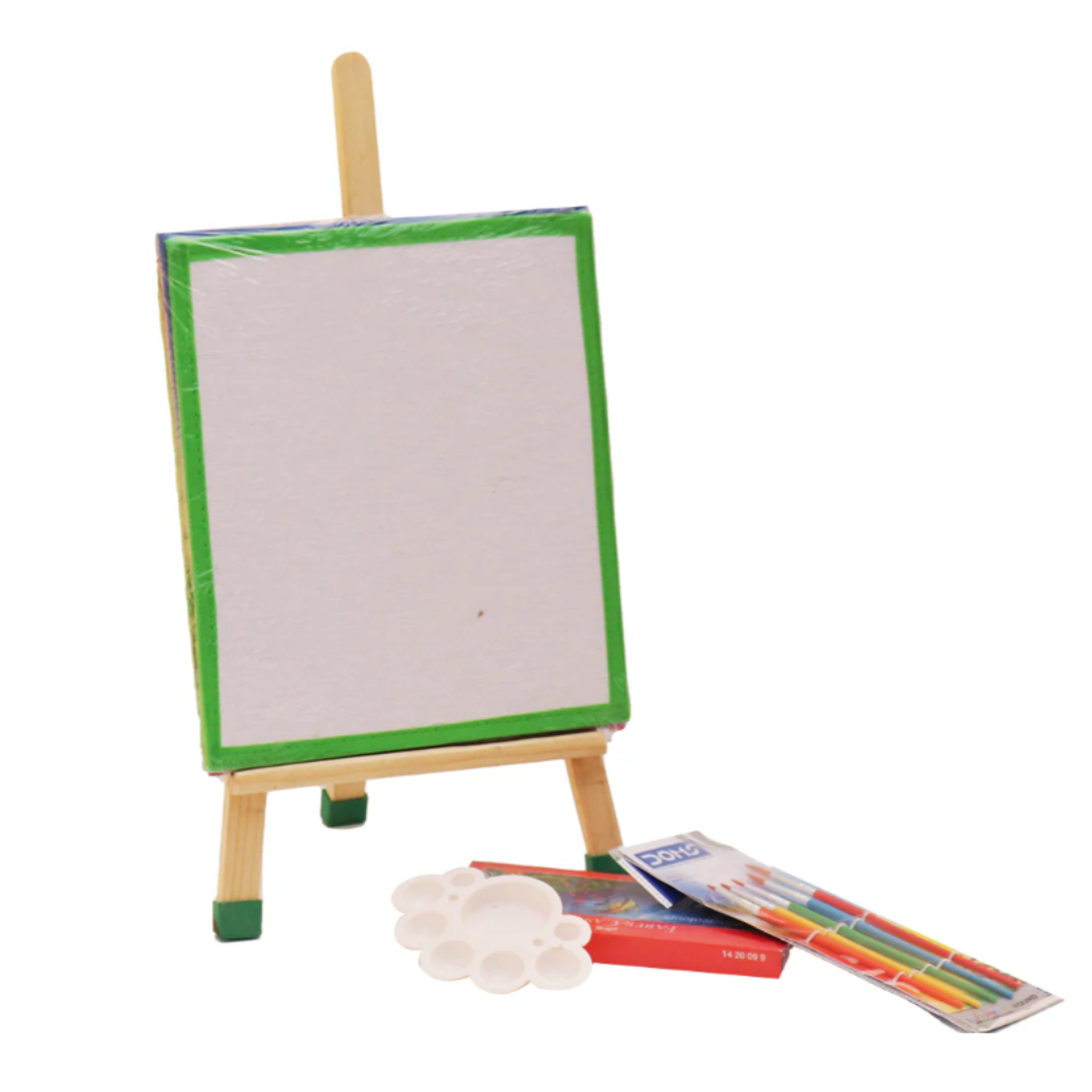 Contents: 1 wooden easel, 2 canvas sheets, 12 acrylic paint pots, 5 paint brushes, 1 paint palette