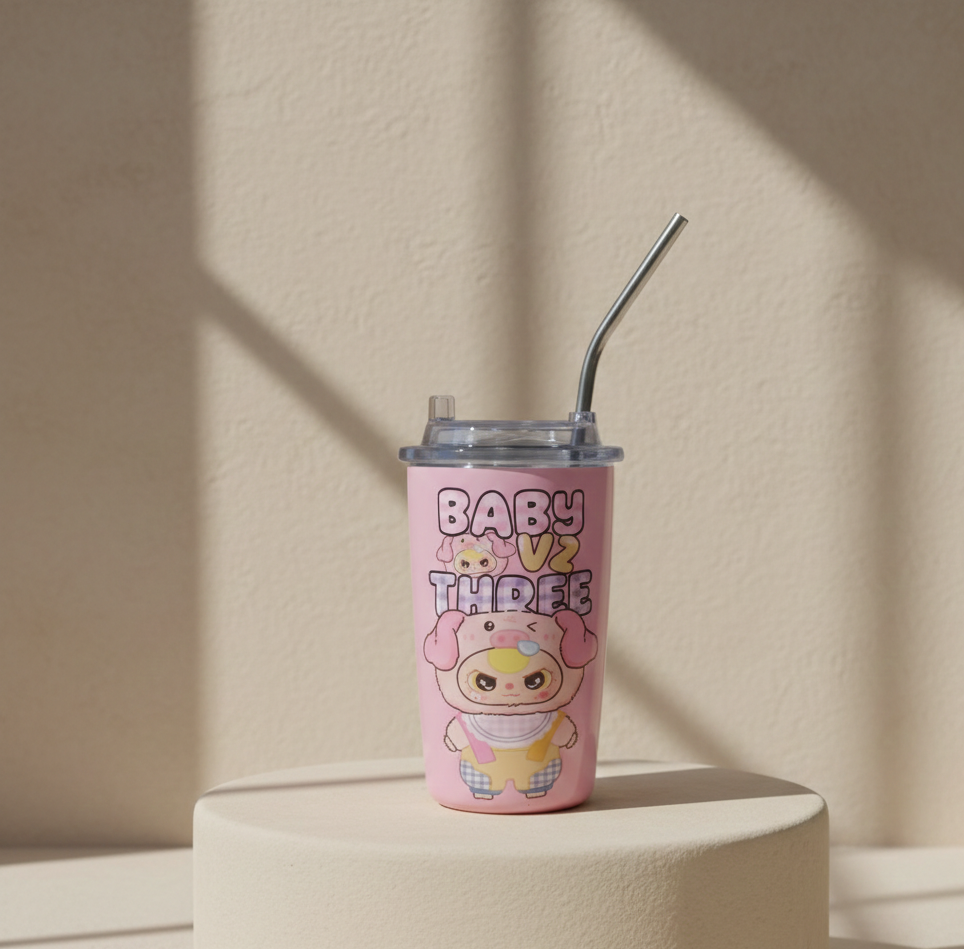 This double-walled stainless steel tumbler is designed to keep drinks at the desired temperature. It features a cute “Baby Three” pig character and comes with a clear splash-proof lid and a reusable metal straw.
